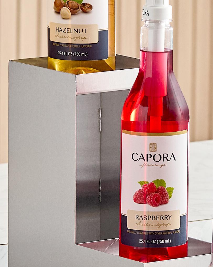 This bottle riser features a step design that makes it easier to see the bottles and reach them than simply placing them flat on the counter. Use it to organize syrups or specialty flavors in a small footprint while ensuring staff can quickly see the contents or label of each bottle.