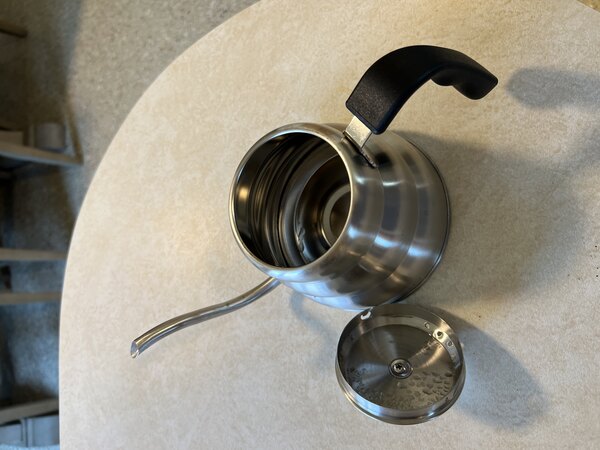 Very nice smooth pour it works VERY well with the acopa glass pour over and it is stove top save and meets all my needs highly recommend!