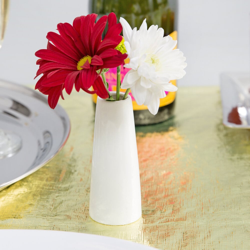 Featuring an attractive, tapered shape and compact design, this bud vase is the perfect addition to tables and countertops. The opening allows you to add single flower buds to add a touch of color to your establishment or catered event. Plus, the vase's bright white coloring creates superior contrast with existing table linens and dinnerware, helping to draw attention to table settings.