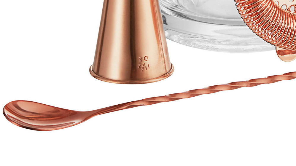 Each of the included pieces serves a unique function to help make the drink mixing process faster and easier. Plus, since all of the pieces are included in this one convenient kit, you can save time finding compatible bar supplies and start mixing drinks right away. Each accessory piece includes an attractive copper finish for a cohesive, professional appearance in any commercial bar setting. When used altogether, this stirring glass kit is an excellent set for any bartender to have on hand for crafting a variety of standard or specialty drinks!