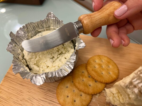 This spreader features a rounded tip blade that allows it to easily cut through and spread soft cheeses. It is ideal for use with soft cheeses like brie, goat cheese, or camembert. Perfect for special occasions and events where presentation matters!