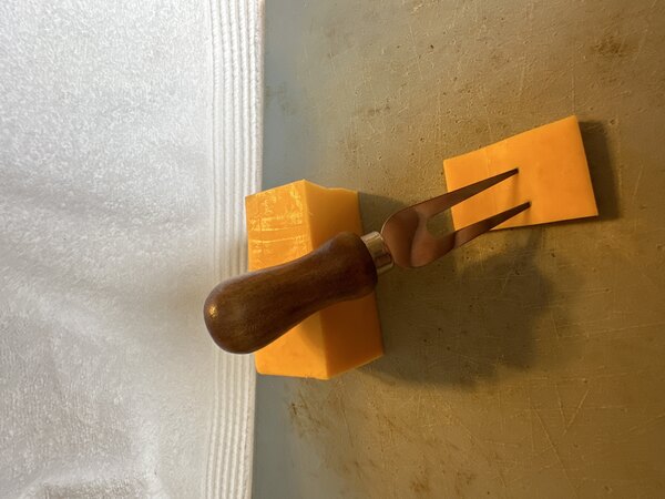 This kitchen cutlery features a forked design that helps to hold cheese in place while cutting wedges and cubes. It offers a sanitary method for slicing and serving cheeses. Its multipurpose design also helps reduce your business's inventory.