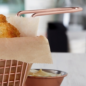 Designed to resist rust and corrosion for long-lasting use, this mini fry basket boasts a durable metal construction with an attractive rose gold finish. Capable of withstanding the wear and tear of commercial kitchen environments, this item's sleek finish also ensures easy cleaning.
