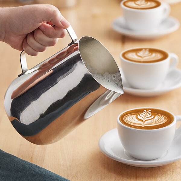 Use this frothing pitcher to add foam and milk to a hot drink, and you can even use it to create latte art atop your beverages to increase their perceived value. By simply moving this frothing pitcher in various motions while pouring the foam, you can create a multitude of designs like hearts, leaves, or flowers. Best of all, this pitcher also doubles as a way to serve cold milk or cream with coffee for tableside service. Treat customers in your coffee shop or cafe to a creamy hot beverage with just the right amount of rich, smooth foam with the help of this 50 oz. frothing pitcher!