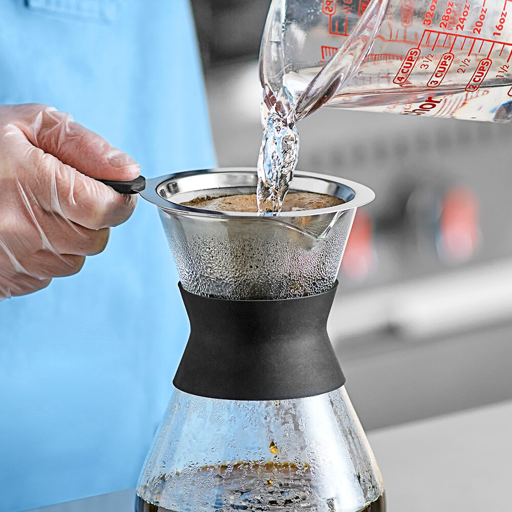 This pour over drip pot features a 6-cup capacity, perfect for providing just the right amount of coffee at your cafe or restaurant. To use, simply place the included stainless steel filter over the top of the glass funnel, add your ground coffee beans, and pour hot water over the beans. Your coffee will begin accumulating at the bottom of the drip pot.