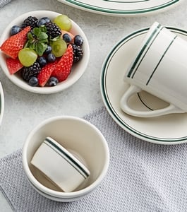 Made of durable stoneware, this cup pairs with additional matching Acopa green band stoneware pieces (sold separately) for a look that can't be beat. The ivory color gives it a timeless touch, while the green band brings a touch of warmth and whimsy to the table.