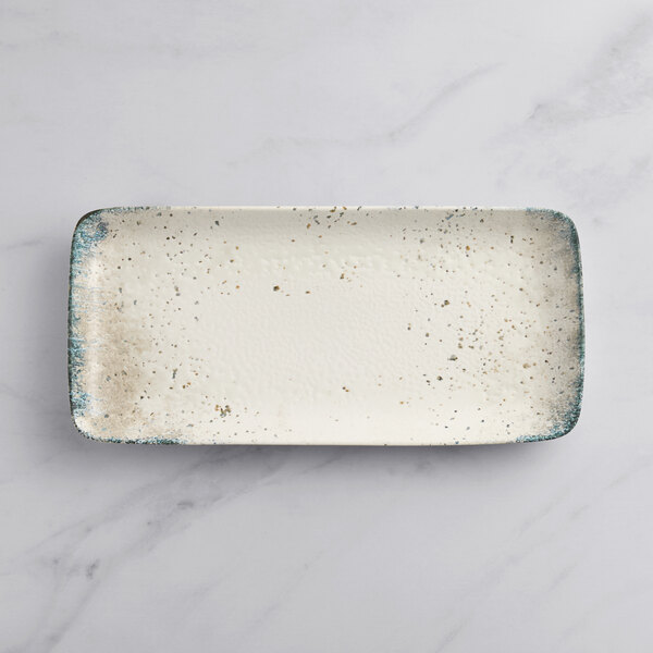 Crafted with fully vitrified porcelain, this platter ensures long-lasting durability that can withstand the demands of commercial use. The concrete gray color speckled with charcoal black pairs with the organic, rugged blue edge design to add a modern touch to your tabletop presentation, providing an understated yet elegant aesthetic that will complement any dish.