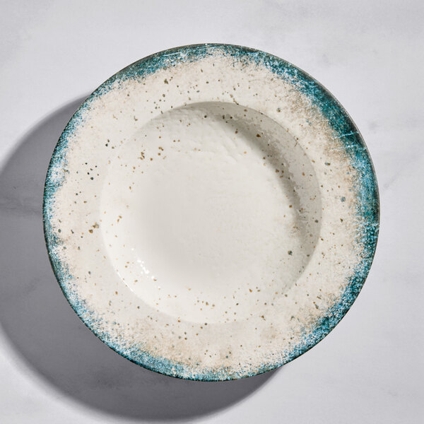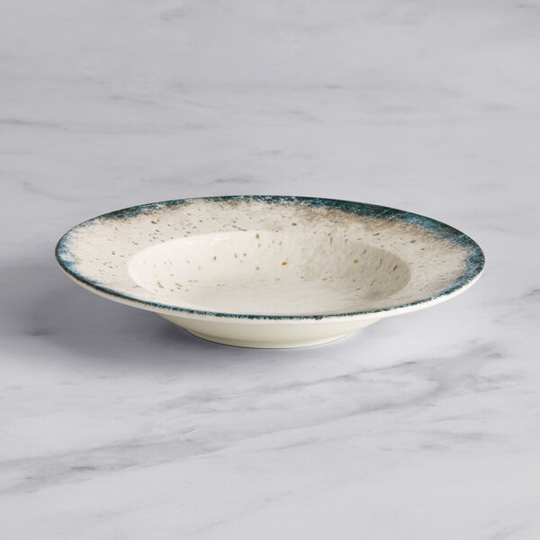 Crafted from fully vitrified porcelain, this bowl provides exceptional durability, ensuring long-lasting use in your upscale restaurant, diner, or cafe. The concrete gray color speckled with charcoal black pairs with the organic, rugged blue edge design to offer an understated modern aesthetic that will complement any tabletop setting.