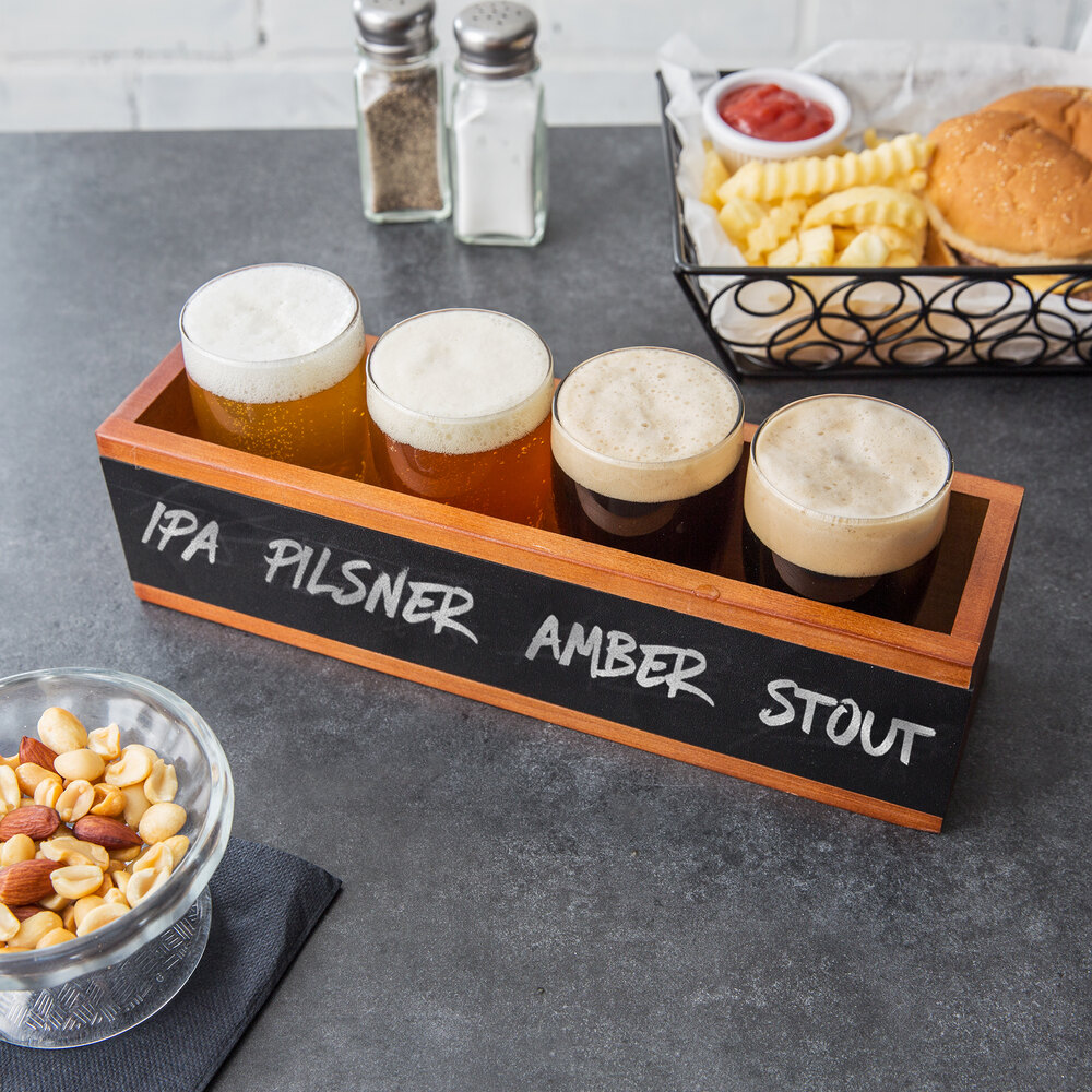 Complete with (12) 5 oz. Acopa Barbary taster glasses and 3 write-on flight crates, this set features everything you need to serve your samples in style. From restaurants to bars, this is the perfect addition to your beverage service so guests can sample a few different types of brews at once. The glasses fit perfectly into the paddle for a cohesive, dynamic presentation.