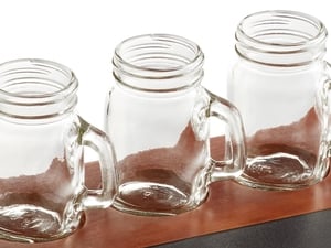 Complete with (12) 4.75 oz. Acopa mini mason jar taster glasses and 3 write-on flight trays with four 2 1/4" diameter cutouts, the traditional mason jar design of the glasses, and the rustic walnut finish of the paddle deliver a classic look sure to charm your patrons. The paddle's chalk strip surface allows you to label each item for easy identification.