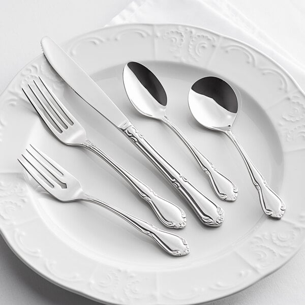 Featuring a subtle scroll pattern and curved soft edges, each piece is constructed to fit comfortably in your patrons' hands. The set is made of beautifully hand-polished stainless steel and has a mirror shine that will elevate any table setting and catch your guests' attention. It's the perfect addition to any catering operation, restaurant, bed and breakfast, or hotel and is a stylish alternative to average flatware!