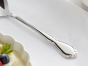 Featuring a subtle scroll pattern and curved soft edges, this dinner / dessert spoon is constructed to fit comfortably in your patrons' hands.
