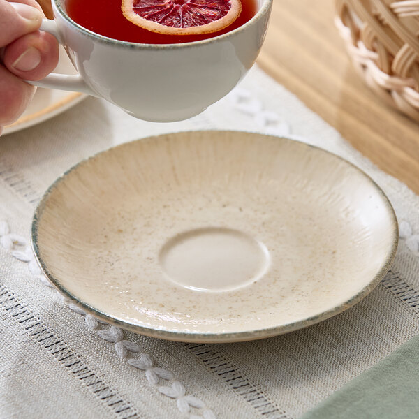 Crafted from fully vitrified porcelain, this saucer offers exceptional durability, ensuring long-lasting use in your establishment. The earthy gray color and weathered design provide a timeless coastal aesthetic, adding a touch of charm to your tabletop settings. Designed to protect tabletops from spills and drips, this porcelain saucer helps maintain cleanliness and organization in your dining area. Whether you're serving signature hot lattes, tea, or hot chocolate, the Acopa Cape saucer is a versatile and practical addition to your servingware collection.