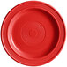 This piece features a passion fruit red color that adds a pop of color for extra pizazz. It has an iconic rolled edge design that's easy on your servers' hands, yet looks elegant on a creative tabletop. Its concentric, embossed design is great for drawing attention to your food!