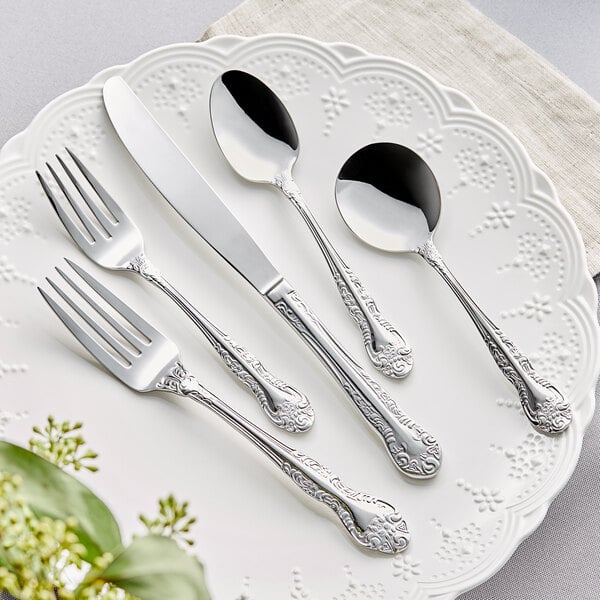 By ordering this Acopa sample, you're able to touch and see it in person to ensure it meets all the unique requirements of your foodservice space before committing to the purchase of any full case from the Acopa Capulet line. Prepare an enchanting table setting with this Acopa Capulet 5-piece flatware sample set. Acopa's Capulet flatware collection features a beautiful floral and scroll design, perfect for creating elegant and inviting table settings at your restaurant or special events. The bright mirror finish reflects light to deliver a polished presentation to your guests. With the Capulet line's classic vintage design, every meal is accompanied by a sense of tradition and charming detail.