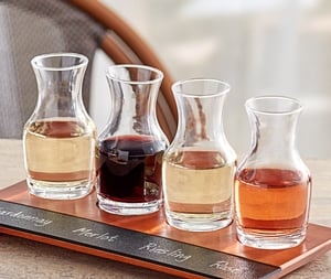 Complete with (12) 6 oz. Acopa carafes and 3 write-on flight trays, these carafes are the perfect vessel for service. These carafes are 6 oz. filled to the brim and 4 oz. filled to the shoulder. The clear glass construction and elegant shape provide a sophisticated air to your drink service. Use them to serve your guests your signature wines or cocktails.