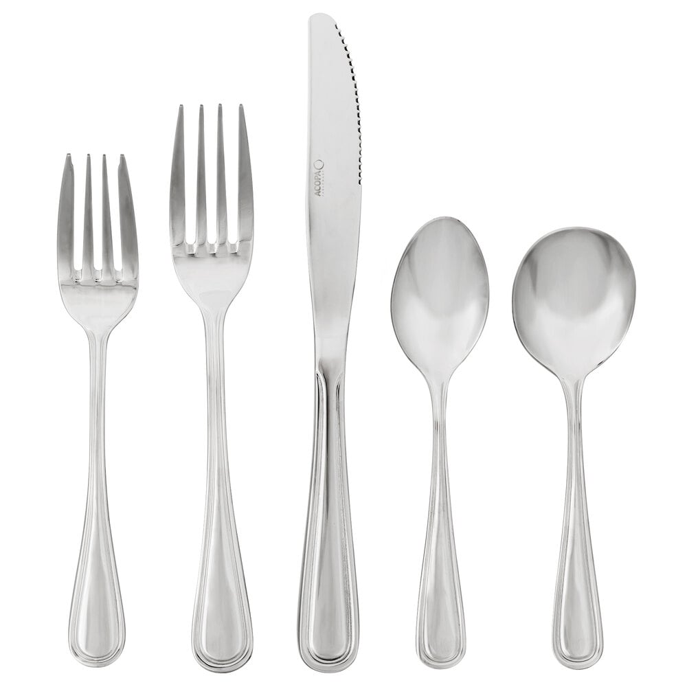 By ordering this Acopa sample, you're able to touch and see it in person to ensure it meets all the unique requirements of your foodservice space before committing to the purchase of any full case from the Acopa Edgeworth line. This set includes a dinner fork, salad fork, bouillon spoon, teaspoon, and a dinner knife, all with a mirror polished finish for a sophisticated appearance. Your guests are sure to appreciate the sturdy construction of this flatware, and it won't break your budget! Made of stainless steel, it will be a long lasting and attractive addition to your busy dining area. It is great for completing table settings at bistros, cafes, and catered events.