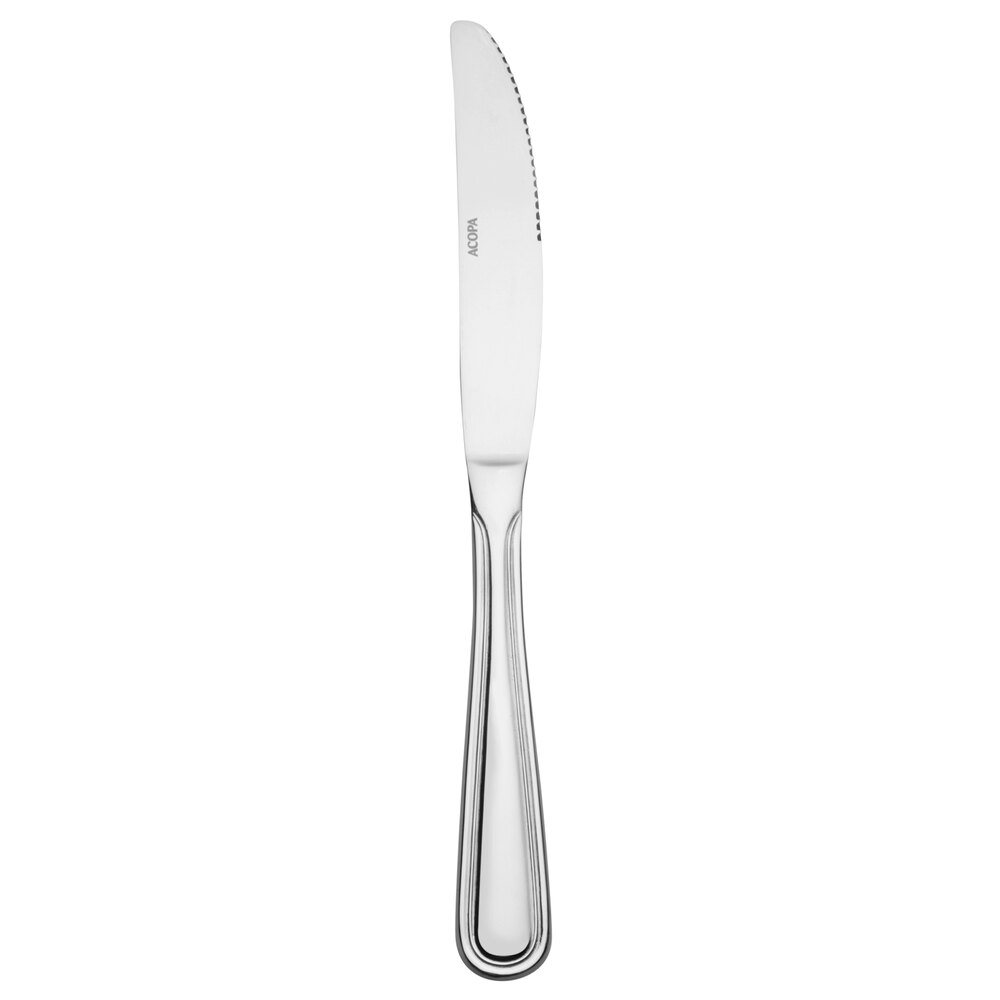 Complete your table setting with this Acopa Edgeworth European table knife. Pair it with the full Edgeworth line (sold separately) to meet any of your tabletop or catering needs! Your guests are sure to appreciate the sturdy construction of this flatware, and it won't break your budget! Made of stainless steel, it will be a long lasting and attractive addition to your busy dining area. It is great for completing table settings at bistros, cafes, and catered events.