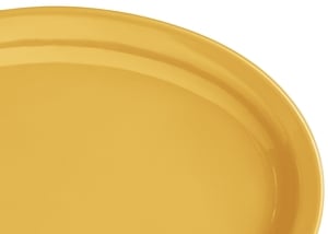 This platter is ideal for serving large portions of your most delicious breakfast foods or dinner entrees with sides. It is designed with an ergonomic oval shape and a narrow rim. The rim expertly frames each dish and helps prevent messes or spills by keeping foods and sauces contained on the platter! Plus, this platter's beautiful yellow color will catch the attention of your patrons and complement your signature foods.