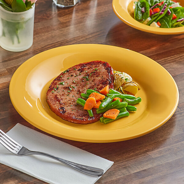 This plate is ideal for serving appetizers, sides, and desserts. It is designed with a wide rim that expertly frames each dish and helps prevent messes or spills by keeping foods and sauces contained on the plate! Plus, its beautiful yellow color will catch the attention of your patrons and complement your signature foods, allowing them to seemingly pop off the table.