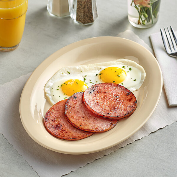 This platter is ideal for serving large portions of your most delicious breakfast foods or dinner entrees with sides. It is designed with an ergonomic oval shape and a wide rim. The rim expertly frames each dish and helps prevent messes or spills by keeping foods and sauces contained on the platter! Plus, this platter's neutral tan color provides optimal contrast, allowing your vibrant foods to seemingly pop off the table for an eye-catching appearance.