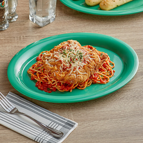 This platter is ideal for serving large portions of your most delicious breakfast foods or dinner entrees with sides. It is designed with an ergonomic oval shape and a wide rim. The rim expertly frames each dish and helps prevent messes or spills by keeping foods and sauces contained on the platter! Plus, this platter's beautiful green color provides optimal contrast, allowing your vibrant foods to seemingly pop off the table for an eye-catching appearance.