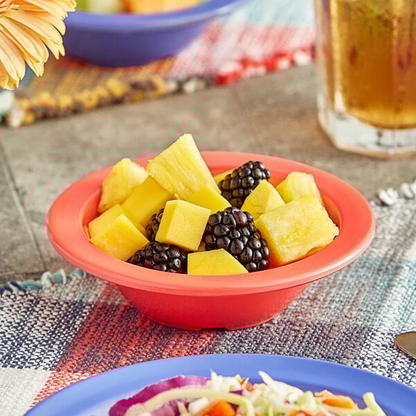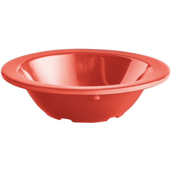 This fruit dish is ideal for serving small sides of fresh fruit or vegetables. It is designed with a narrow rim that expertly frames each dish and helps prevent messes or spills by keeping foods and sauces contained in the dish! Plus, its beautiful orange color will catch the attention of your patrons and complement your signature foods, allowing them to seemingly pop off the table.