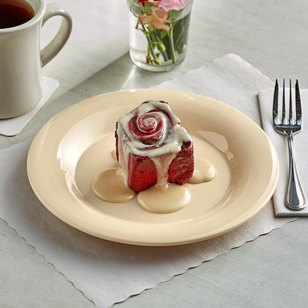 This plate is ideal for serving appetizers, sides, and desserts. It is designed with a wide rim that expertly frames each dish and helps prevent messes or spills by keeping foods and sauces contained on the plate! Plus, its neutral tan color will catch the attention of your patrons and complement your signature foods, allowing them to seemingly pop off the table.