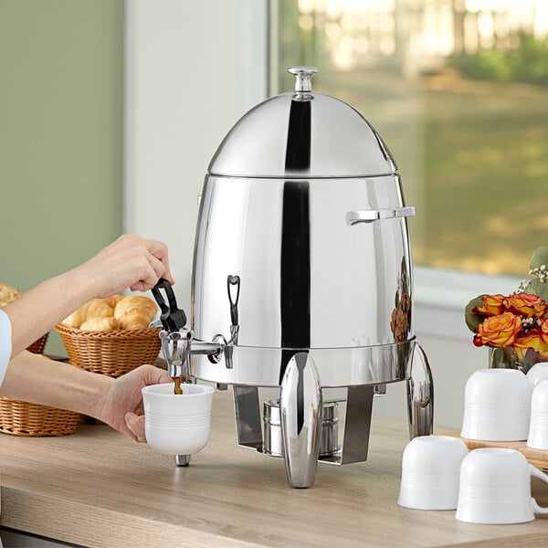 Featuring a sleek, bullet-shaped design, this urn is perfect for dispensing hot beverages at upscale restaurants, banquets, and receptions. Simply place a can of chafer fuel on the incorporated fuel can holder and light it to keep the chafer's contents warm throughout the length of your event. Its heavy-duty construction makes it 15% heavier than traditional chafer urns. Best of all, this chafer can be used at both indoor and outdoor venues.