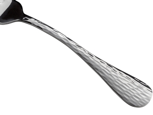 Acopa's Industry flatware collection combines traditional and contemporary elements for a sleek, eye-catching look. Hammered handles provide a distinct feel while beautifully capturing and reflecting light, delivering a polished presentation to your guests.