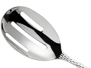 With the Acopa Industry flatware collection among your dinnerware supplies, creating an unforgettable table setting is right within reach. This serving spoon features clean, rounded lines and a stylish, hammered handle that will hide unsightly fingerprints and blemishes. With a slotted design, it is perfect for dishing out and draining your signature sides with excess liquid.