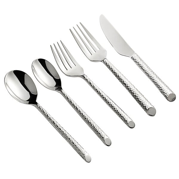 By ordering this Acopa sample, you're able to touch and see it in person to ensure it meets all the unique requirements of your foodservice space before committing to the purchase of any full case from the Acopa Iris line. Create a refined, memorable table setting with this Acopa Iris 18/8 stainless steel extra heavy weight forged 5-piece flatware sample set. Each piece in the Acopa Iris flatware collection features a forged, rounded handle to offer a comfortable grip and balanced heft in guests' hands. Traditional and contemporary design elements combine for an exquisite and eye-catching appearance. With their hammered design, Iris collection handles catch and reflect light, providing a distinct look and feel while also hiding fingerprints for a presentation that continues to sparkle.