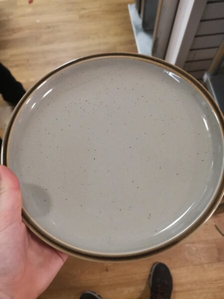 These are solid plates. The speckles of vanilla and the gold rim looks quite nice when compared against the white plates that most people use. The plates are sturdy as well and don't chip or break easily. The edge / rim of the plates does not rise as high as I thought it did, make sure to look at measurements / photos.
