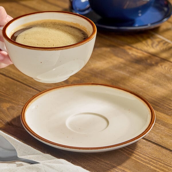 For the perfect combination of rustic style and elegance, introduce this Acopa Keystone 6 1/2" vanilla bean porcelain saucer. Featuring a creamy white glaze, this saucer is complemented by beautiful chestnut brown speckles. It provides both durability and style, making it the ideal backdrop for all of your delicious creations. This piece is unique enough to be used as a standalone dish, or play up your tabletop and mix it with other Keystone pieces of like or varying colors. Pair this saucer with the Keystone 8 oz. vanilla bean porcelain cup (sold separately) for a complete look when serve piping hot coffee and tea.
