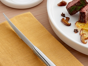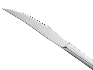 This steak knife features a sleek, square handle with curved, subtle lines for a compelling modern design. Thanks to its firm, heavy weight construction and delicate curves, this steak knife promotes a professional feel and fits nicely into your guests' hands. Plus, it features a simple, yet chic silhouette with a standing design that your guests will appreciate.