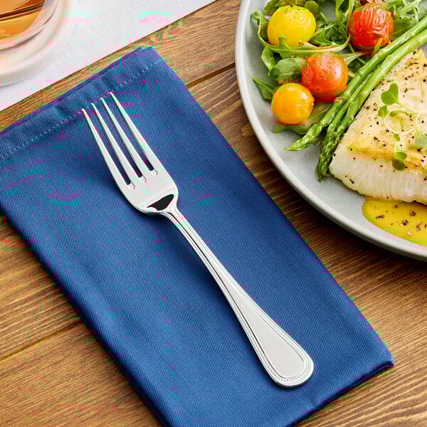 Featuring a classic beaded rim with a smooth, rounded handle, this dinner fork is constructed to fit comfortably in your patrons' hands. Its beautifully hand-polished stainless steel construction has a mirror shine that will elevate any table setting and is sure to catch your guests' attention. It's the perfect addition to any catering operation, restaurant, or hotel and is ideal for use with main entrees like meat or seafood. Try this dinner fork from the Lydia line for a stylish alternative to average flatware!