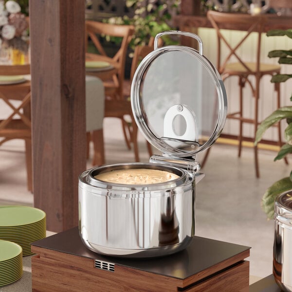 Serve signature dishes in style with this Acopa Manchester 11 qt. round stainless steel soup induction chafer with glass top and soft close lid! This chafer's stainless steel construction perfectly balances elegance and durability. While heavy-duty 304 stainless steel ensures it's equipped for consistent commercial use, its sleek finish and appearance make it a perfect choice for upscale events and a luxurious addition to your table.