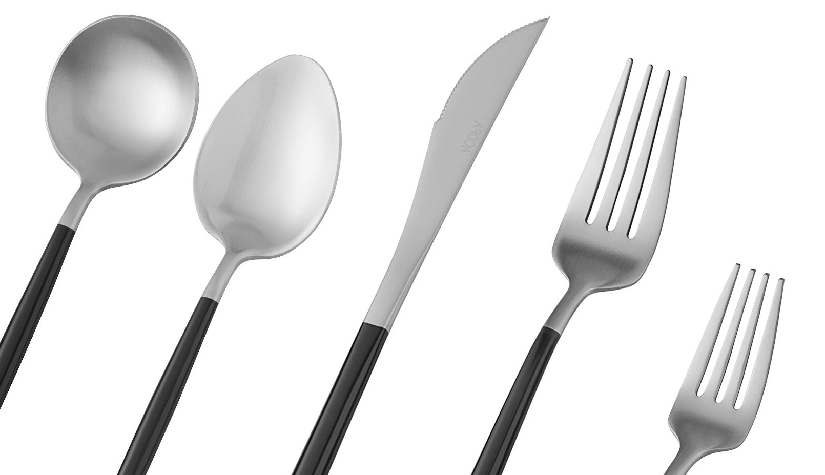 The set includes a dinner fork, salad / dessert fork, dinner knife, bouillon spoon, and teaspoon. Crafted from 18/8 extra heavy weight stainless steel, this flatware is durable and long-lasting. It has a rare, two-toned black and silver color scheme with a brushed finish that hides fingerprints and adds luster. This flatware is comfortable to hold, easy to use, and pleasing to look at.