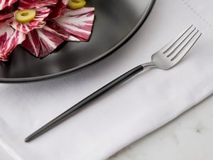 Crafted from 18/8 extra heavy weight stainless steel, this salad / dessert fork is durable and long lasting. It has a rare, two-toned black and silver color scheme with a brushed finish that hides fingerprints and adds luster. This fork is comfortable to hold, easy to use, and pleasing to look at.