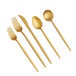 By ordering this Acopa sample, you're able to touch and see it in person to ensure it meets all the unique requirements of your foodservice space before committing to the purchase of any full case from the Acopa Odin line. Balance nuance and tradition with this Acopa Odin 5-piece flatware sample set. Acopa's Odin flatware collection features comfortably slim, forged handles that taper to a point, providing elegance and charm. Its modern yet familiar design is sleek, slender, and alluring. This set is suited to a variety of fine dining establishments and special catered events, making it a versatile and fun addition to your collection. This set includes a dinner fork, salad / dessert fork, dinner knife, bouillon spoon, and teaspoon. Crafted from 18/8 extra heavy weight stainless steel, this flatware is durable and long-lasting. It has an eye-catching gold color with a brushed finish that hides fingerprints and adds luster. This flatware is comfortable to hold, easy to use, and pleasing to look at.