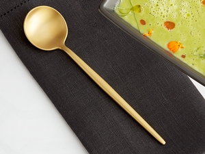 Crafted from 18/8 extra heavy weight stainless steel, this bouillon spoon is durable and long-lasting. It has an eye-catching gold color with a brushed finish that hides fingerprints and adds luster. This spoon is comfortable to hold, easy to use, and pleasing to look at.