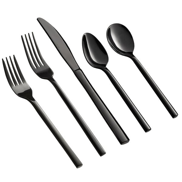 By ordering this Acopa sample, you're able to touch and see it in person to ensure it meets all the unique requirements of your foodservice space before committing to the purchase of any full case from the Acopa Phoenix line. Create a modern, trendy table setting with this Acopa Phoenix 5-piece flatware sample set. This set features clear lines and modern design that will add a sleek touch to any dining area. Its stunning black mirror, hand-polished finish creates a sophisticated, dramatic appearance without taking the focus away from your perfectly plated culinary creations.