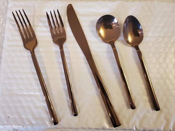 The color on these are amazing!! Beautiful shine and great weight in the hand. The narrow lines give a good grip! Beautiful set!