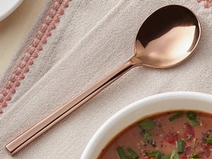 Serve this bouillon spoon with your soups and stews to provide guests with an unforgettable dining experience. Each piece in this versatile collection is designed with soft edges and a slim handle, and is perfectly weighted and balanced to feel comfortable in your patrons' hands. Its rose gold mirror-shine, hand-polished finish offers a sophisticated, professional appearance, yet doesn't take the focus away from your perfectly plated culinary creations.