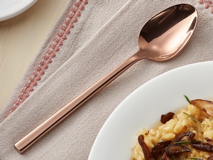 Serve this dinner / dessert spoon with your rice and vegetables, or your ice creams, custards, and other sweet treats to provide guests with an unforgettable dining experience. Each piece in this versatile collection is designed with soft edges and a slim handle, and is perfectly weighted and balanced to feel comfortable in your patrons' hands. Its rose gold mirror-shine, hand-polished finish offers a sophisticated and timeless touch to tables, yet doesn't take the focus away from your perfectly plated culinary creations.