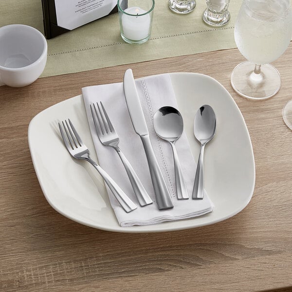 By ordering this Acopa sample, you're able to touch and see it in person to ensure it meets all the unique requirements of your foodservice space before committing to the purchase of any full case from the Acopa Ridge line. Create a memorable table setting with this Acopa Ridge 18/0 stainless steel heavy weight 5-piece flatware sample set. Ridge tableware pieces put a modern twist on the classic baguette handle style. With attractive curves and a handle divided into two identical panels by a raised midline, Ridge pieces offer visual interest to table settings without taking the focus away from your perfectly plated culinary creations. Each piece in this versatile collection is perfectly weighted and balanced to feel comfortable in your patrons' hands.