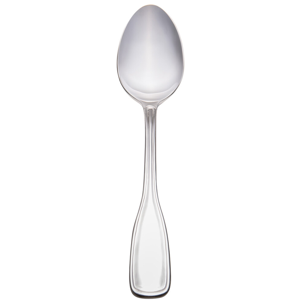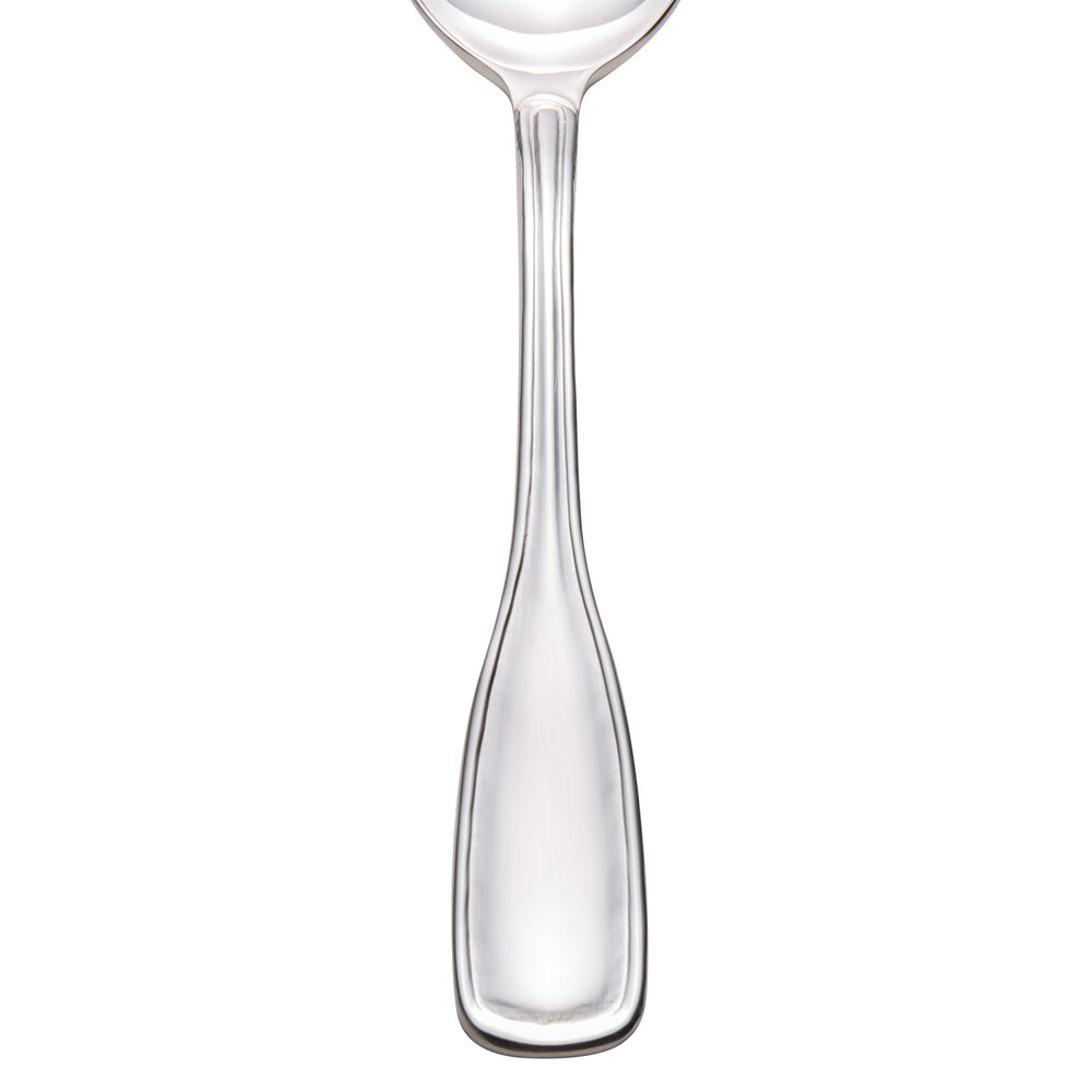 The Acopa Saxton line features a subtle design that will both blend in with and complement a variety of dinnerware styles. Serve this spoon with entrees and desserts at your restaurant, bistro, or cafe. Its tasteful design and heavy weight make it elegant enough for a catered event, but its simplicity also make it a great everyday choice to go along with your standard dinnerware.
