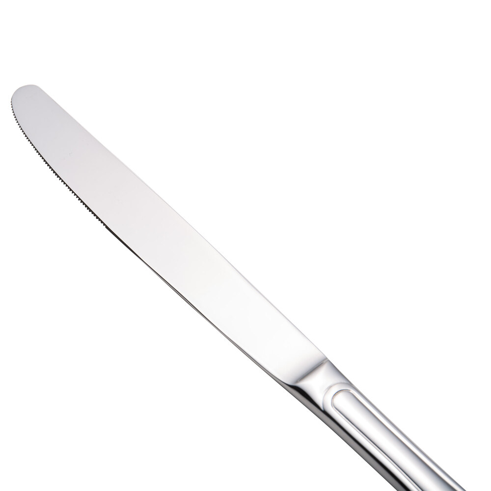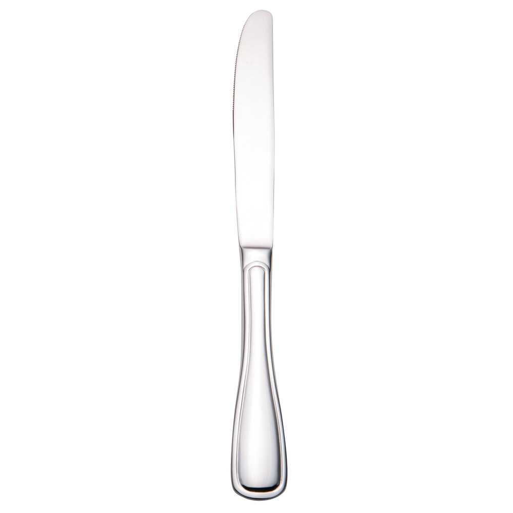 Complete your table setting with this Acopa Saxton 9 5/8" stainless steel heavy weight dinner knife. Pair it with the rest of the Saxton line to create an understated yet stylish look that will complement your classic dinnerware. Your guests are sure to appreciate the sturdy construction of this flatware, and it won't break your budget! Made of stainless steel, it will be a long lasting and attractive addition to your busy dining area. It's great for completing table settings at bistros, wine bars, and cafes.