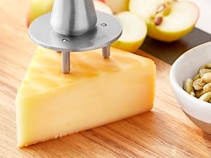 This clincher promotes safety by keeping hands away from knives while cutting. It easily punctures any cheese to offer a more sanitary method of cutting without any physical handling.