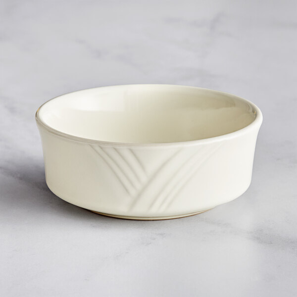 Classic design meets elegant embellishment with this Acopa Swell 11 oz. ivory (American white) embossed stoneware cereal bowl!